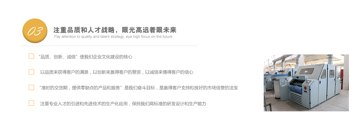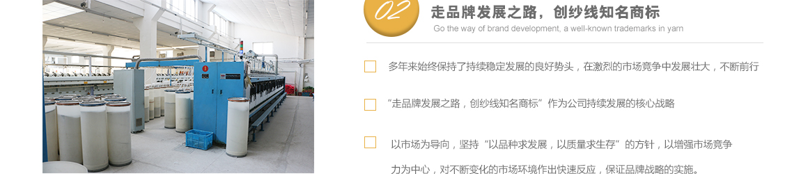 太倉市高陽工貿(mào)有限公司是專業(yè)從事特種紗生產(chǎn)十數(shù)年的一線生產(chǎn)廠家,坐落于江蘇省蘇州市太倉市雙鳳鎮(zhèn)新湖建湖路29號,太倉隸屬長江三角洲經(jīng)濟圈,交通便捷,經(jīng)濟發(fā)達,是著名的紡織生產(chǎn)基地。 公司歷史要追溯到1982年就成立的新湖毛紡織廠。1996年,毛紡織廠與上海二十二棉在新湖聯(lián)合組建了太倉市新湖福利綜合廠。2002年為適應(yīng)市場的飛速變化,公司轉(zhuǎn)制重組更名為太倉市高陽工貿(mào)有限公司。同時公司適時調(diào)整生產(chǎn)經(jīng)營策略,調(diào)整產(chǎn)品品種結(jié)構(gòu),把生產(chǎn)特種紗作為主要發(fā)展方向,純棉、滌綸竹節(jié)紗是我們的主要產(chǎn)品。 公司多年來始終保持了持續(xù)穩(wěn)定發(fā)展的良好勢頭,在激烈的市場競爭中發(fā)展壯大,不斷前行。我們把“走品牌發(fā)展之路,創(chuàng)紗線知名商標”作為公司持續(xù)發(fā)展的核心戰(zhàn)略。以市場為導(dǎo)向,堅持“以品種求發(fā)展,以質(zhì)量求生存”的方針,以增強市場競爭力為中心,對不斷變化的市場環(huán)境作出快速反應(yīng),品牌戰(zhàn)略的實施。公司注重專業(yè)人才的引進和先進技術(shù)的生產(chǎn)化應(yīng)用,具備較強的研發(fā)設(shè)計和生產(chǎn)能力。 公司一直把“品質(zhì)、創(chuàng)新、誠信”作為企業(yè)文化建設(shè)的核心。以品質(zhì)來獲得客戶的滿意,以創(chuàng)新來贏得客戶的贊賞,以誠信來博得客戶的信心。我們把“準時的交貨期,提供零缺點的產(chǎn)品和服務(wù)”作為奮斗目標,贏得了客戶的支持和良好的市場信譽。 高陽工貿(mào)有限公司愿與廣大客戶加強合作,共享信息,迎接挑戰(zhàn),共同發(fā)展。客戶需求。了解詳細>>